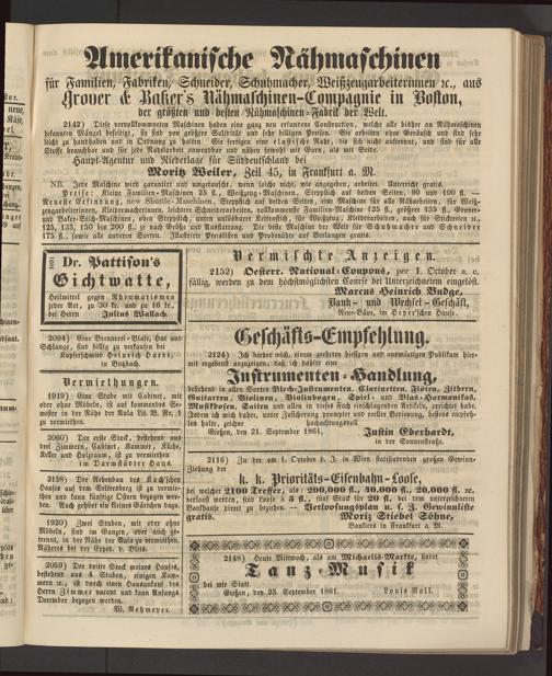 Preise: Kleine .Familien-Maschinen 25 fl., Weißzeug - Maschinen, Steppstich auf beiden Seiten, 90 und 100 fl. — Neueste Erfind ung, new Shuttle - Maschinen, Steppstich auf beiden Seiten, eine Maschine für alle Näharbeiten, für Weißzeugarbeiterinnen, Kleidermacherinnen, leichtere Schneivcrarbeiten, vollkommenste Familien-Maschine 125 fl., größere 135 fl., Grover- und Baker-Stich-Maschinen, oben Steppstich, unten unlösbarer Kettenstich, für Weißzeug, Kleiderarbeiten, auch für Stickereien ic., 125, 135, 150 bis 200 fl., je nach Größe und Ausstattung. Die beste Maschine der Welt für Schuhmacher und Schneider 175 fl., sowie alle anderen Sorten. Jllustrirte Preislisten und Probenähte auf Verlangen gratis.