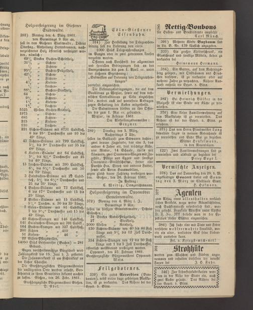 Die Großherzoglichen Bürgermeistereien der umliegenden Orte werden ersucht, Vorstehendes in ihren Gemeinden bekannt machen zu lassen. Gießen, den 26. Febr. 1861.