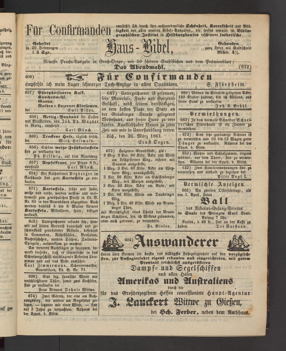 667) Unterzeichneter ist gesonnen, sein Material-, Färb- Und Spezerei- Geschäft, nebst seinem dreistöckigen, an dem besten Platze der Stadt an der Grünberger Straße gelegenes Wohnhaus, aus freier Hand zu verkaufen. Kaufliebhaber können zu jeder Zeit mit mir in Unterhandlung treten.