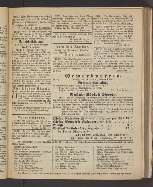 2891) Da das Verzeichniß der hiesigen Mitglieber des Gustav-Adolph-Vereins neu ausgestellt werden soll, so richten wir an diejenigen unsrer evangelischen Mitbürger, welche noch nicht beige treten sind, dies, aber beabsichtigen, die freundliche Bitte, bis zum Jahreswechsel davon eines der unterzeichneten Vorstandsmitglieder gefälligst in Kenntniß zu setzen. Gießen, am 11. Deeember 1861.
