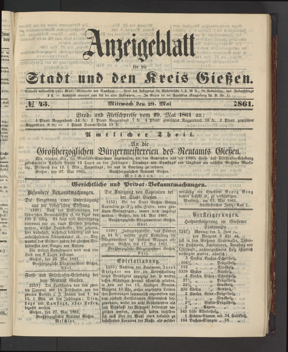 .Gießen, den 27. Mai 1861. Großherzogliches Rentamt Gießen.