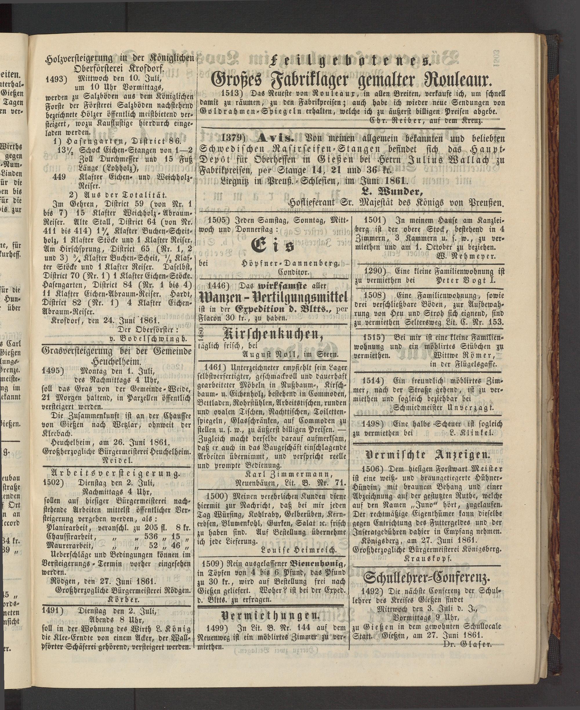 Mittwoch den 3. Juli d. I., Vormittags 9 Uhr, zu Gießen in dem gewohnten Schullocale Statt. Gießen, am 27. Juni 1861.