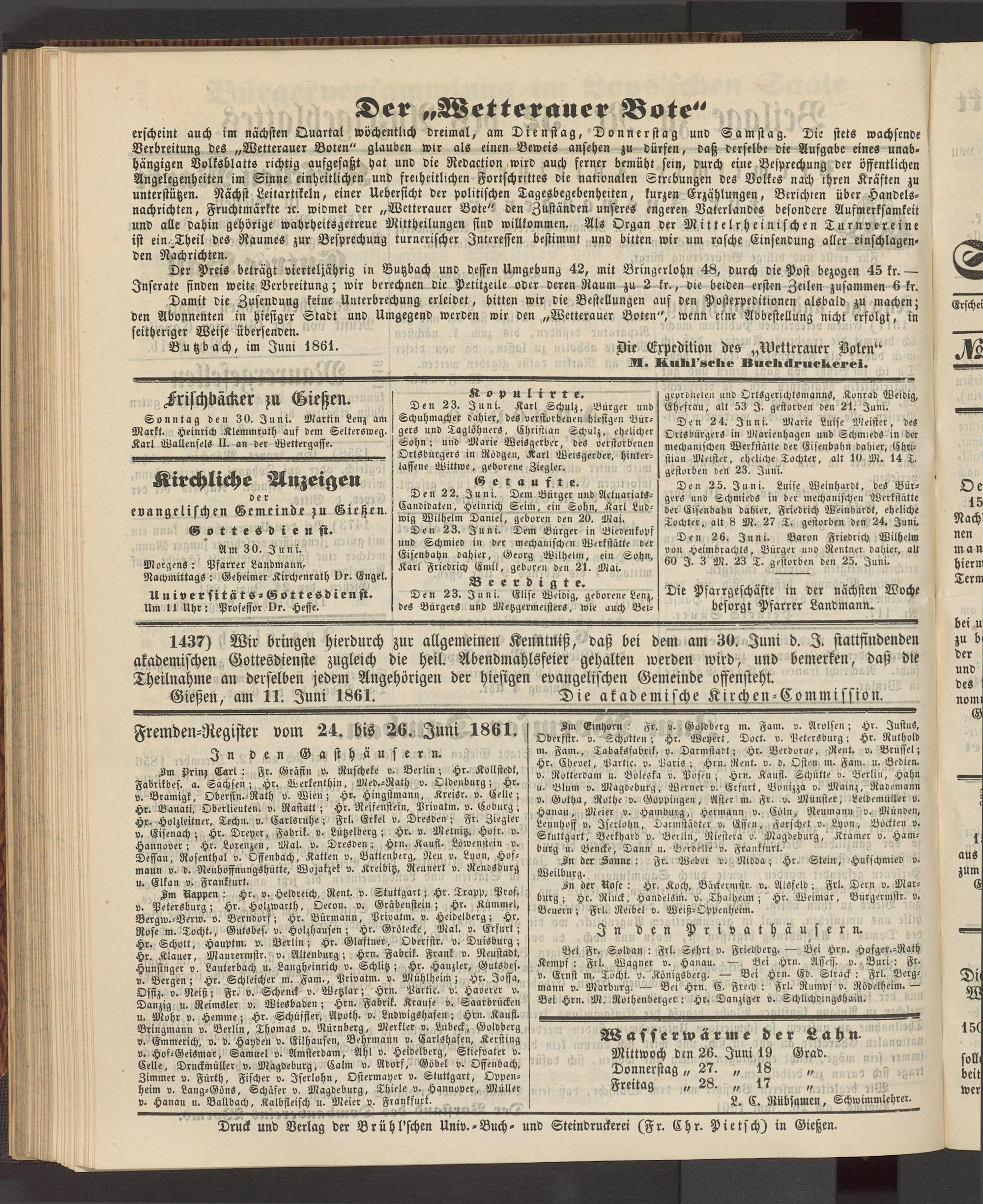 Fremden-Register vom 24. bis 26. Juni 1861.