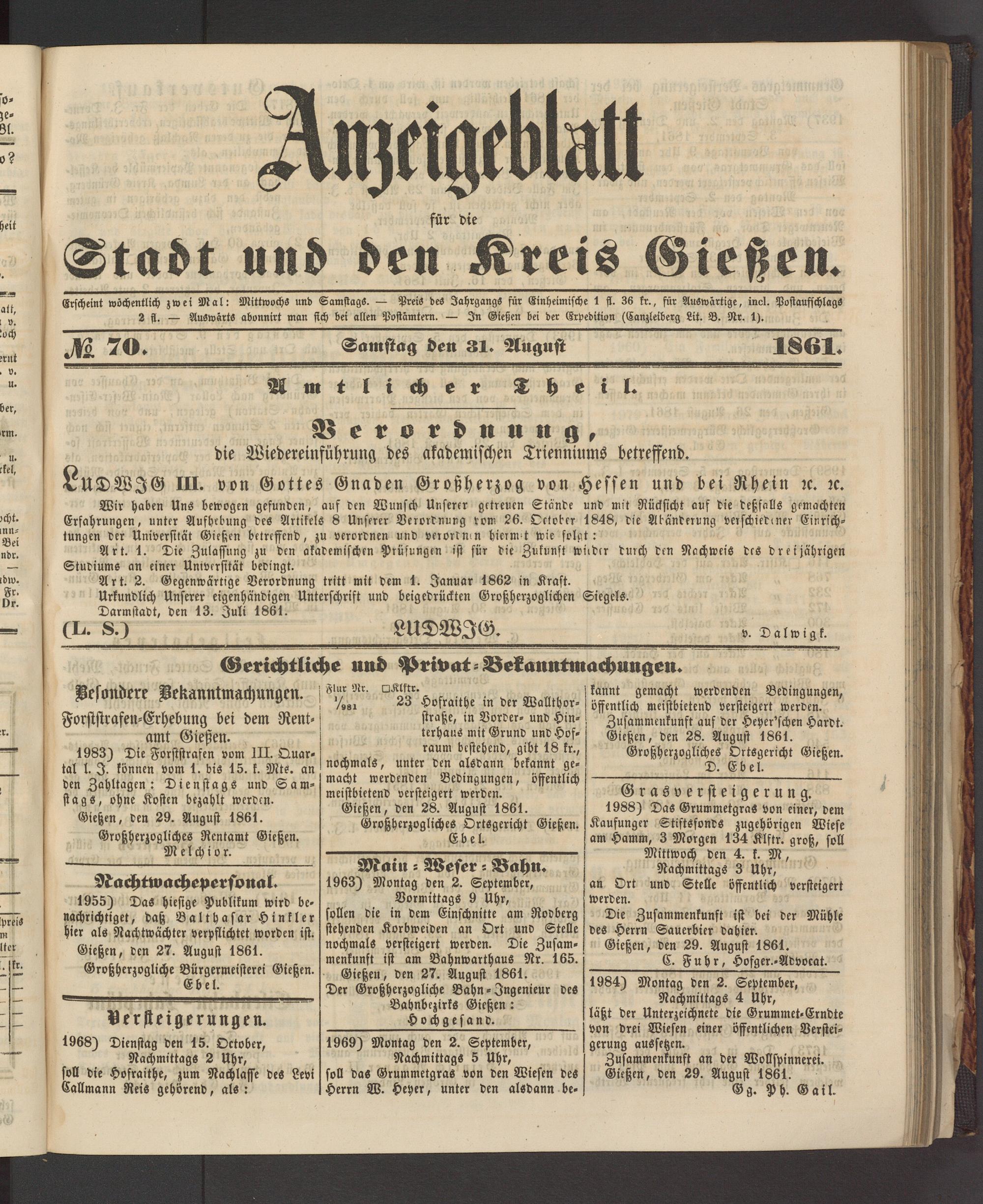 Gießen, den 28. August 1861. Großherzogliches Ortsgericht Gießen.