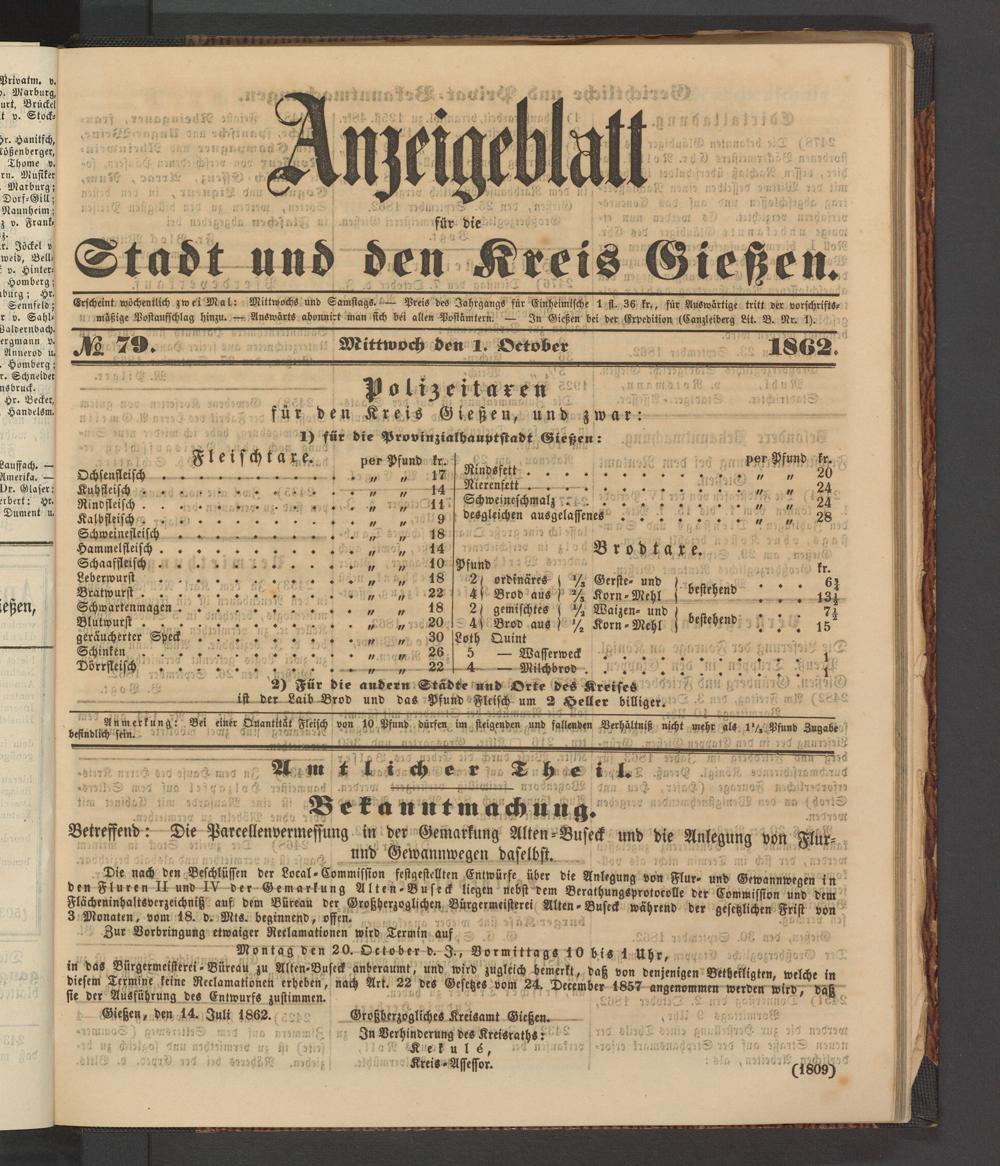 Erscheint wöchentlich zwei Mal: Mittwochs und Samstags.— Preis des Jahrgangs für Einheimische 1 st. 36 fr., für Auswärtige tritt der vorschriftsmäßige Postauffchlag hinzu. — Auswärts abvnnirt man sich bei allen Postämtern. — In Gießen bei der Erpcdition (Canzleiberg Lit. B. Nr. 1).