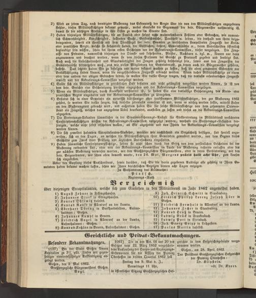 8) Die sich gemeldet habenden Ercapitulanten-Einsteher, worüber wir nachstehend ein Verzeichniß beifügen, sind specicll anzuweisen, sich an den Tagen, an welchen die Militärpflichtigen ihrer Gemeinden gemustert werden, vor dem Beginn dieses Geschäfts zum Zweck ihrer Prüfung und ärztlichen Untersuchung einzufinden.