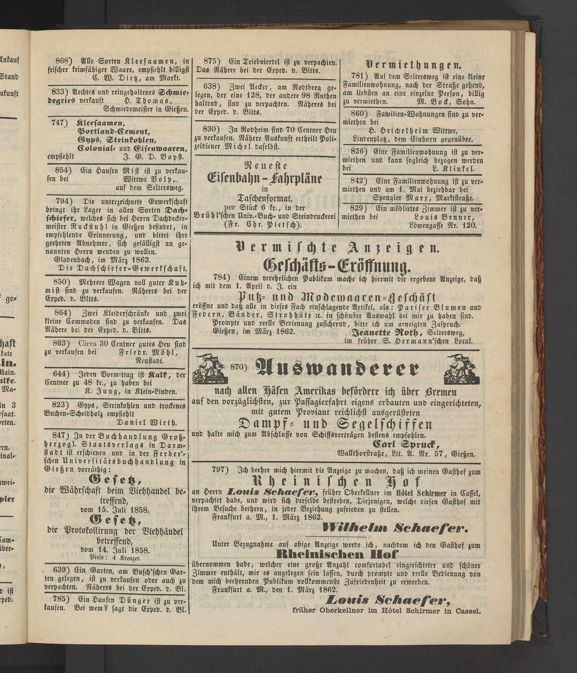 Gießen, im März 1862. Jeanette Roth, Seltersweg,