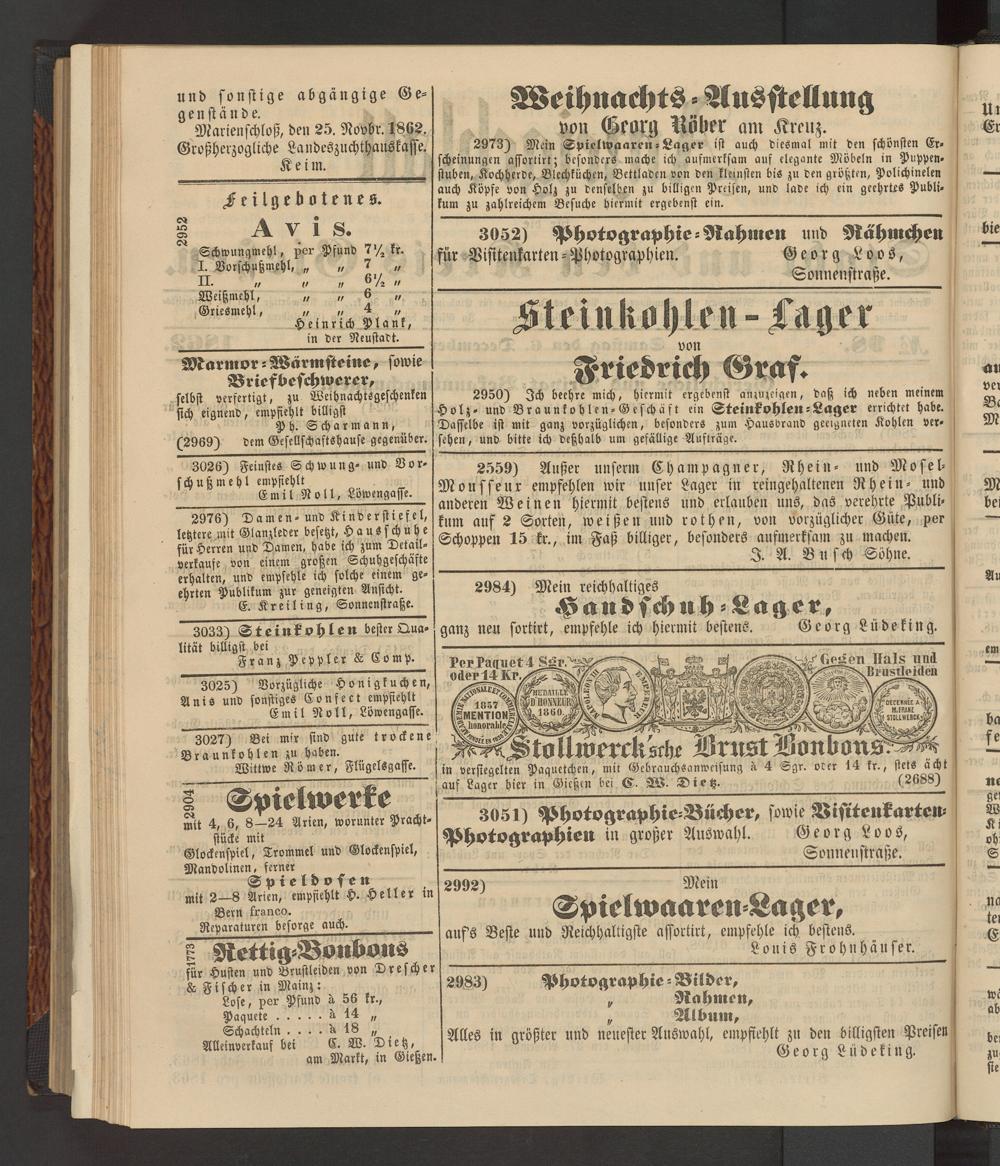 2950) Ich beehre mich, hiermit ergebenst an,uzeigen, daß ich neben meinem Holz- und Braunkohlen-Geschäft ein Steinkohlen-Lager errichtet habe. Dasselbe ist mit ganz vorzüglichen, besonders zum Hausbrand geeigneten Kohlen versehen, und bitte ich deßhalb um gefällige Aufträge.