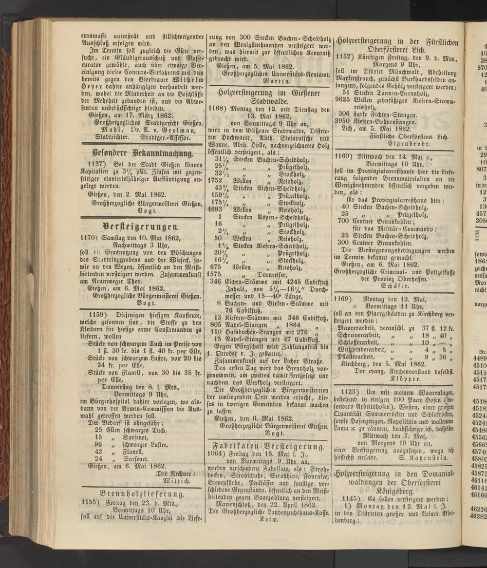 1168) Montag den 12. und Dienstag den 13. Mai 1862, von Vormittags 9 Uhr an, wird in dem Gießener Stadtwalbe, Distric- ten Hochwarte, Abth. Steinrutsche und Wanne, Abth. Hölle, nachverzeichnetes Holz öffentlich versteigert, als: