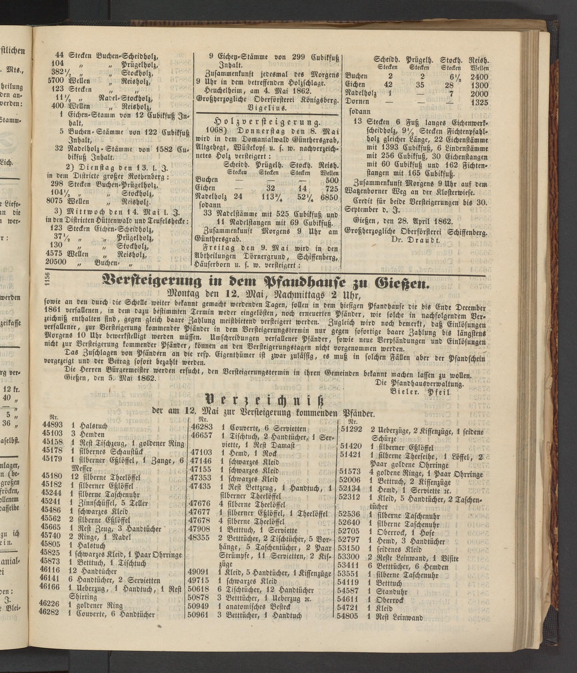 Gießen, den 28. April 1862. Großherzogliche Oberförsterei Schiffenberg.