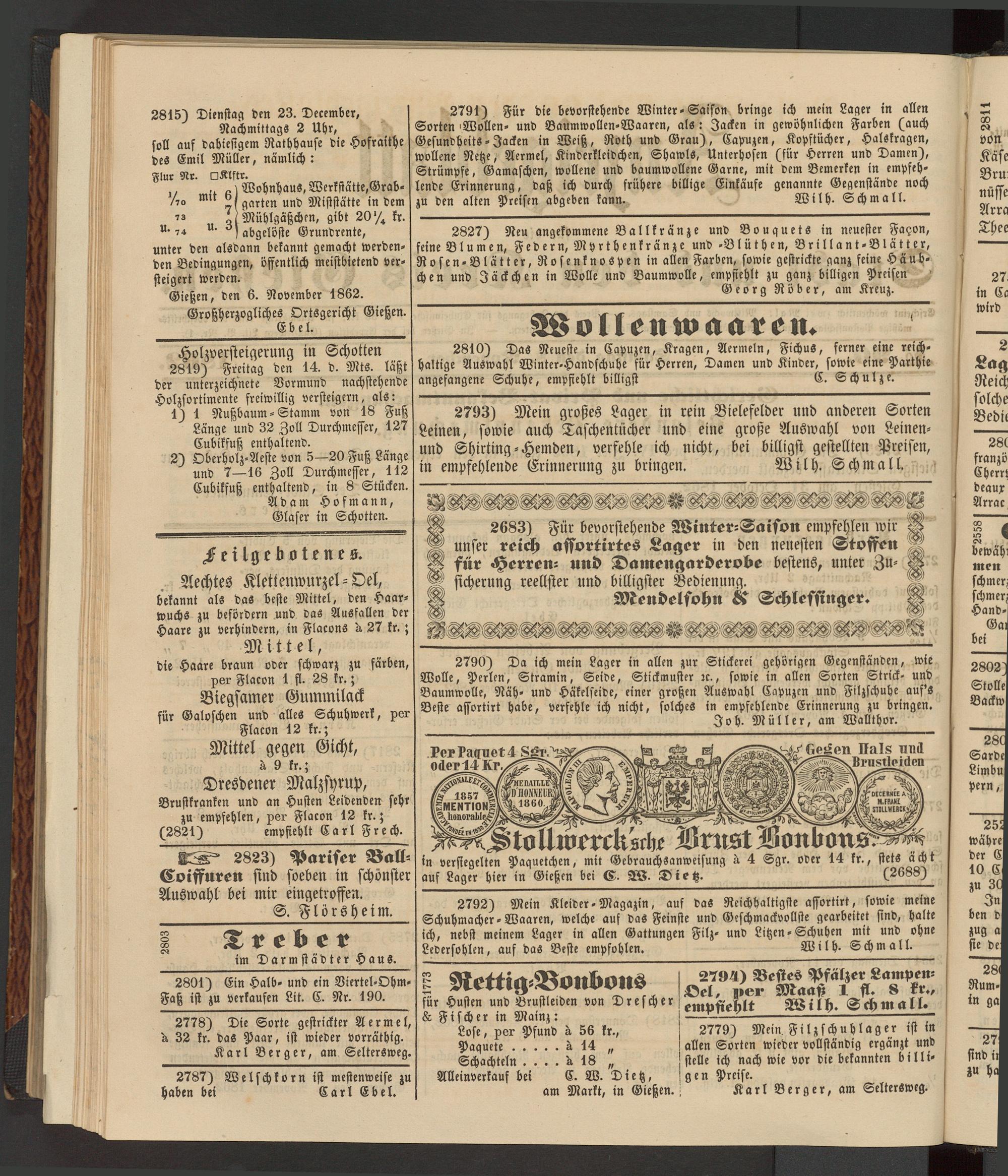 2791) Für die bevorstehende Winter-Saison bringe ich mein Lager in allen Sorten «Wollen- und Baumwollen-Waaren, als: Jacken in gewöhnlichen Farben (auch Gesundheits-Jacken in Weiß, Roth und Grau), Capmzen, Kopftücher, Halskragen, wollene Netze, Aermel, Kinderkleidchen, Shawls, Unterhosen (für Herren und Damen), Strümpfe, Gamaschen, wollene und baumwollene Garne, mit dem Bemerken in empfehlende Erinnerung, daß ich durch frühere billige Einkäufe genannte Gegenstände noch zu den alten Preisen abgeben kann. Wilh. Schmall.