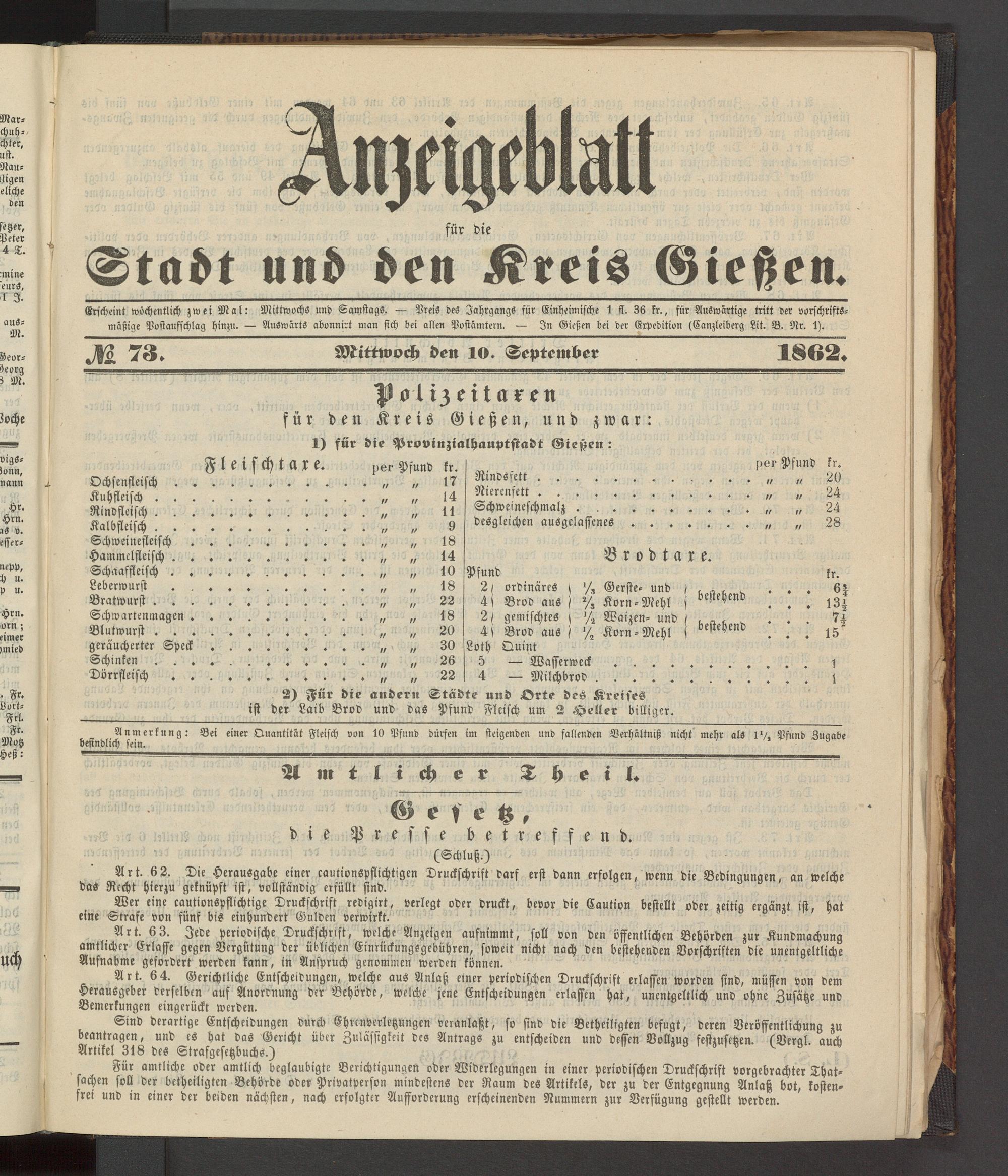 Erscheint wöchentlich zwei Mal: Mittwochs und Samstags. — Preis des Jahrgangs für Einheimische 1 fl. 36 fr., für Auswärtige tritt der vorschriftsmäßige Postaufschlag hinzu. — Auswärts abonnirt man sich bei allen Postämtern. — In Gießen bei der Expedition (Canzleiberg Lit. B. Nr. 1).