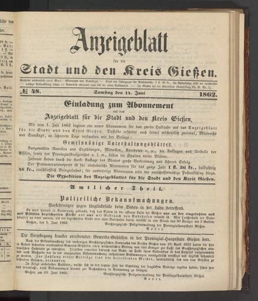 Giißin, am 10. Ium 1862. Großherzogliche Polizeiverwaltung der Provinzialhauptstadt Gießen.