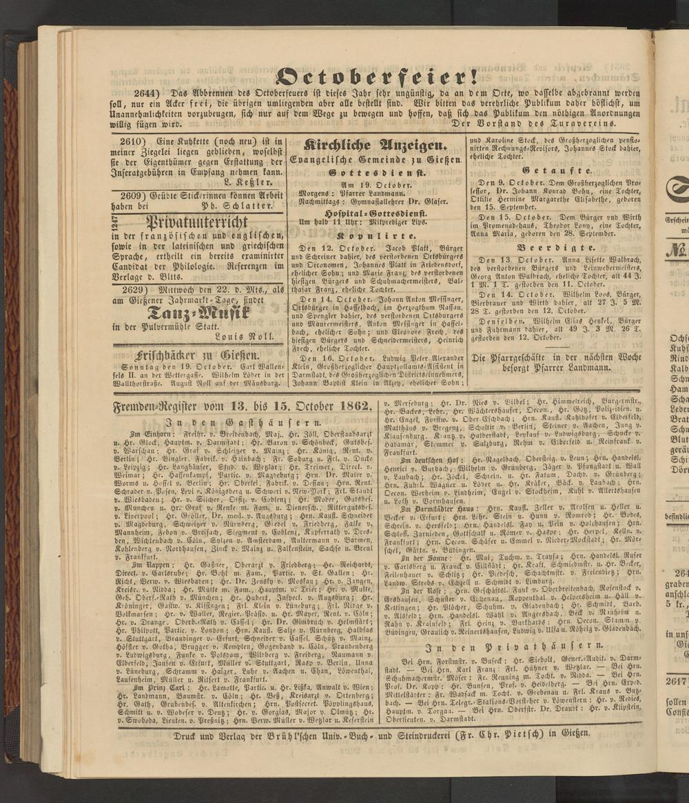 Im Darmstädter Haus: Hrn. Kaufl. Zeller v. Arolsen u. Heller u. Becker v. Erfurt; Hrn. Lehr. Stein u. Hunn v. Romrod; Hr. BodeS, Schrein, v. Hersfelo; Hrn. Handelsl. Fay u. Pein v. Holihausen; Hrn. Schloss. Zurnieden, Gottschalk u. Römer v. HaSve; Hr. Herpel, Kelln, v. Frankfurt; Hrn. Lecon. Schäfer u. Emmel v. Nieder-Mockstadt; Hr. Mörschel, Gärtn. v. Büdingen. ,