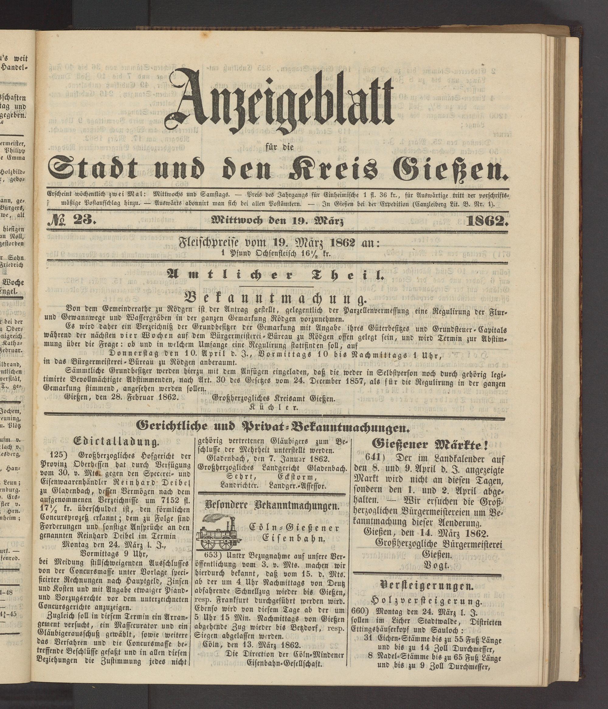 Gießen, den 28. Februar 1862. Großherzogliches Kreisamt Gießen.