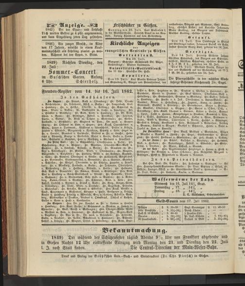 1849) Der während des Schützenfestes täglich Abends 9V2 Uhr von Frankfurt abgehende und in Gießen Nachts 12 Uhr eintreffende Ertrazug wird Montag den 21. und Dienstag den 22. Juli l. I. noch Statt finden. Die Central-Direction der Main-Weser-Bahn.