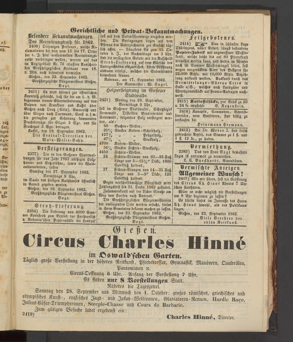 Gießen, den 23. September 1862." Großherzogliche Bürgermeisterei Gießen. __Vogt.