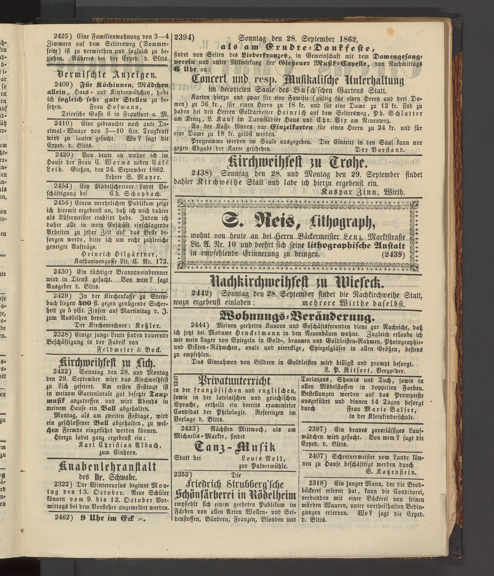 2420) Von heute an wohne ich im Hause der Frau C. Worms neben Safe Leib. Gießen, den 24. September 1862. __________________Lehrer S. Maye r.