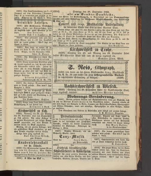 2422) Sonntag den 28. und Montag den 29. September wird das Kirchweihfest zu Lich gefeiert. Am ersten Festtage ist in meinem Gartenlocale gut besetzte Tanzmusik anzutreffen und wird Abends in meinem Hause ein Ball abgehalten.