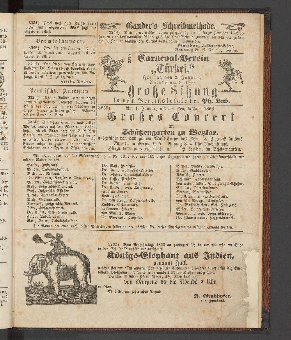 3262) Vom Neujahrstage 1863 an producirt sich in der neu erbauten Bude in der Schulgasse dahier der berühmte