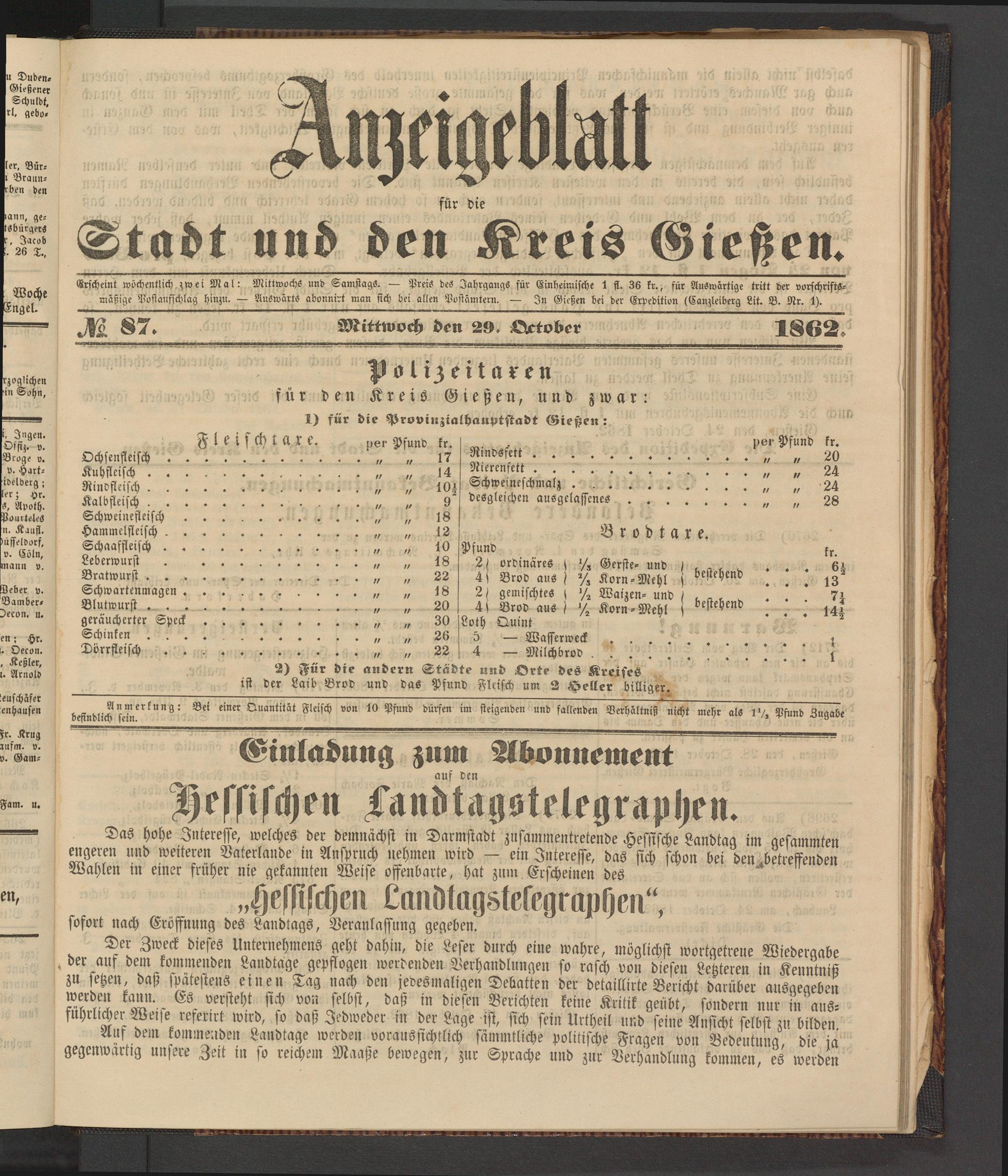 2) Für die andern Städte und Orte des Kreises ist der Laib Brod und das Pfund Fleisch um 2 Heller billiger.