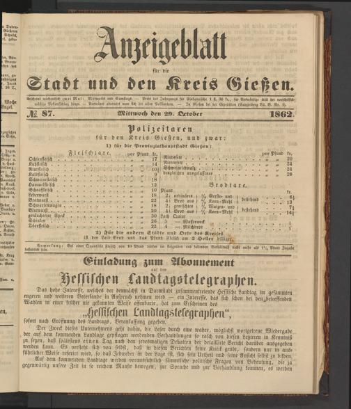 Erscheint wöchentlich zwei Mal: Mittwochs und Samstags. — Preis des Jahrgangs für Einheimische 1 st. 36 fr., für Auswärtige tritt der vorschriftsmäßige Postaufschlag hinzu. — Auswärts abonnirt man stch bei allen Postämtern. — In Gießen bei der Erpedition (Canzleiberg Lit. B. Nr. 1).