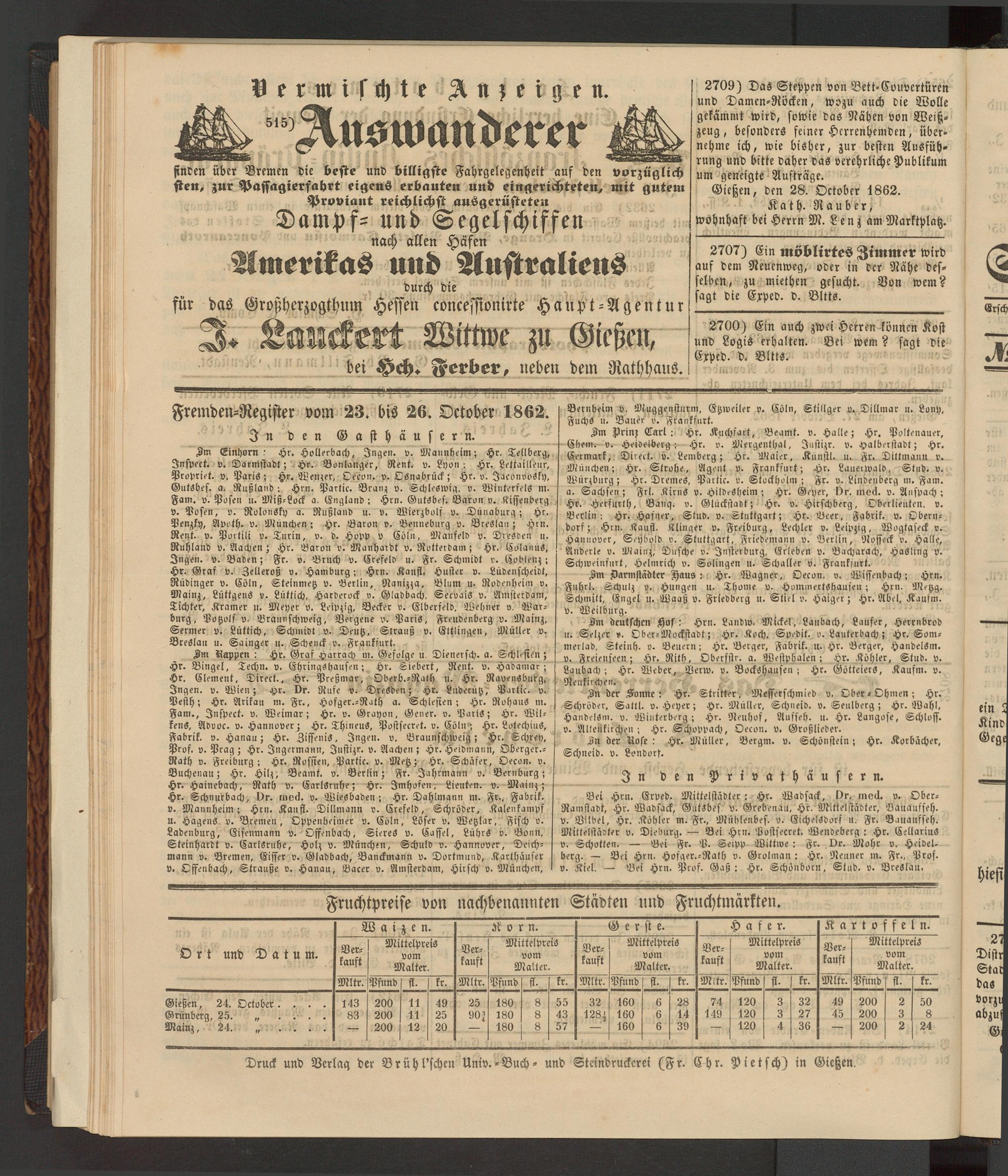 Fremden-Register vom 23. bis 26. October 1862.