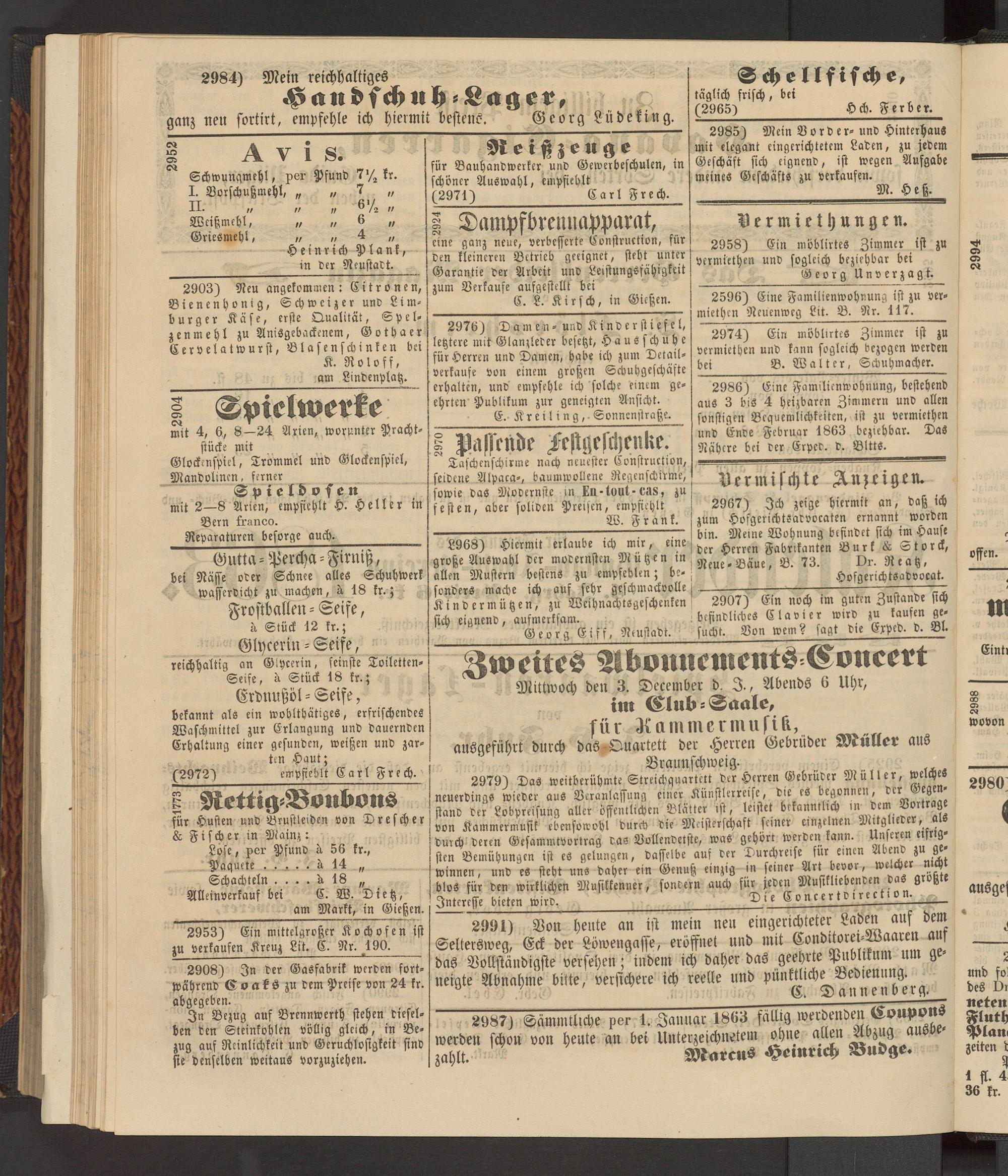 2987} Sämmtliche per 1. Januar 1863 fällig werdenden Coupons werden schon von heule an bei Unterzeichnetem ohne allen Abzug zahlt. Marcus «vemrtch Budge.