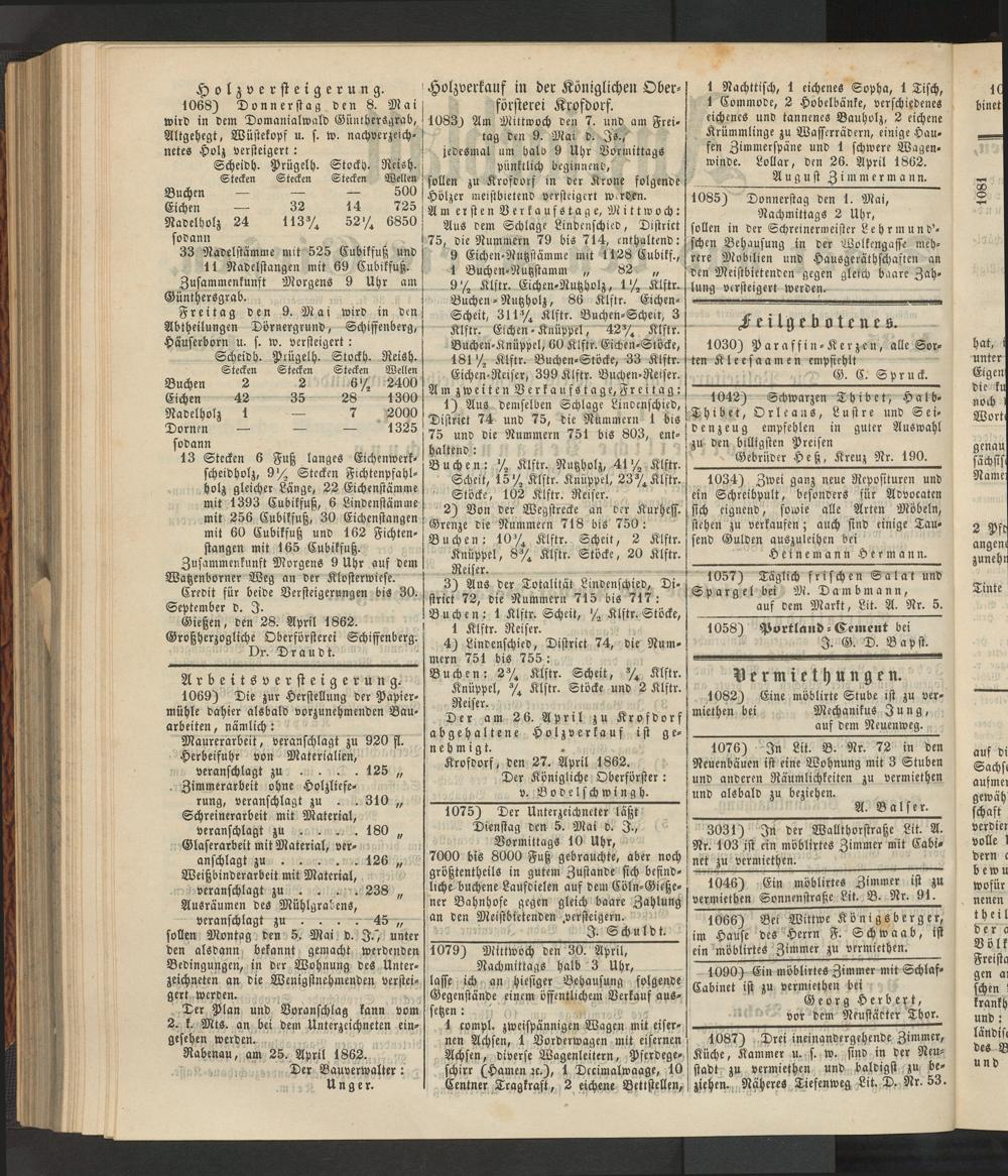 1068) Donnerstag den 8. Mai wird in dem Domanialwald Günthersgrab, Altgehegt, Wüstekopf u. s. w. nachvcrzeich- netes Holz versteigert: