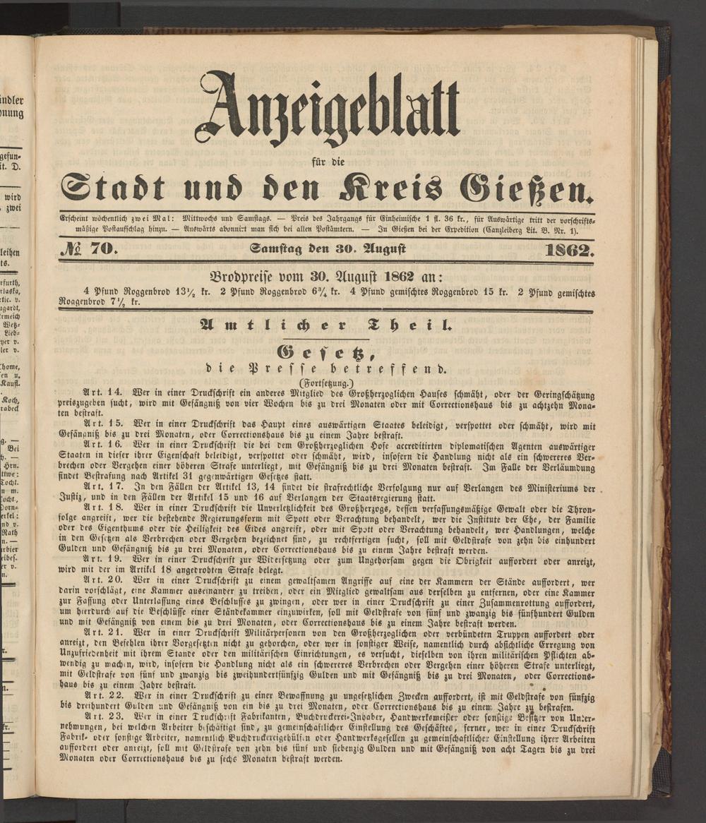 Erscheint wöchentlich zwei Mal: Mittwochs und Samstags. — Preis des Jahrgangs für Einheimische 1 st. 36 fr., für Auswärtige tritt der vorschriftsmäßige Postaufschlag hinzu. — Auswärts abonnirt man fich bei allen Postämtern. — In Gießen bei der Expedition (Canzleiberg Lit. B. Nr. 1).