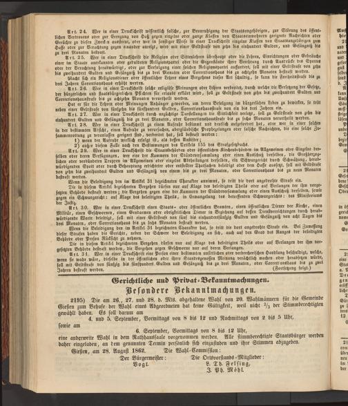 2195) Die am 26., 27. und 28. d. Mts. abgehaltene Wahl von 20. Wahlmännern für die Gemeinde Gießen zum Behufe der Wahl eines Abgeordneten hat keine Gültigkeit, weil nicht 2/s der Stimmberechtigten gewählt haben. Es soll darum am