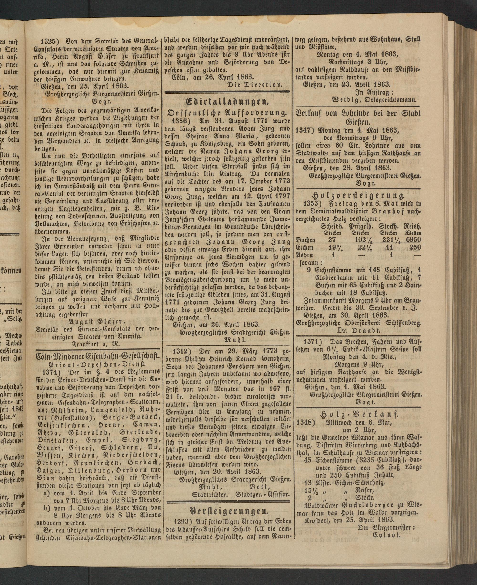 1312) Der am 29. März 1773 gehonte Philipp Heinrich Konrad Gensheim, Sohn Des Johannes Gensheim von Gießen, seit langen Jahren unbekannt wo abweseuD, wirD hiermit aufgefordert, innerhalb einer Frist von Drei Monaten Das in 167 fl. 21 fr. bestehenDe, bisher curatorisch verwaltete, ihm von seinen Eltern zugefallene Vermögen hier in Empfang zu nehmen, wiDrigenfalls derselbe für verschollen erklärt und Dieses Vermögen seinen etwaigen Leibeserben oder nächsten Anverwandten, welche sich in gleicher Frist bei Meidung Des Ausschlusses mit allen Ansprüchen zu melden haben, eventuell aber Dem Großherzoglichen Fiscus überwiesen werDen wirD.