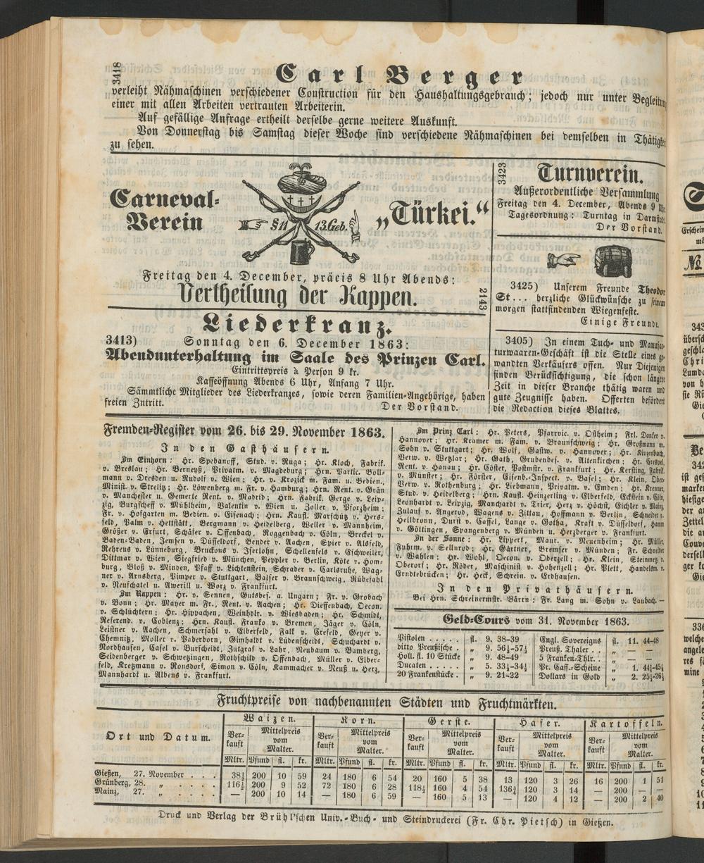 Fremden-Register vom 26. bis 29. November 1863.