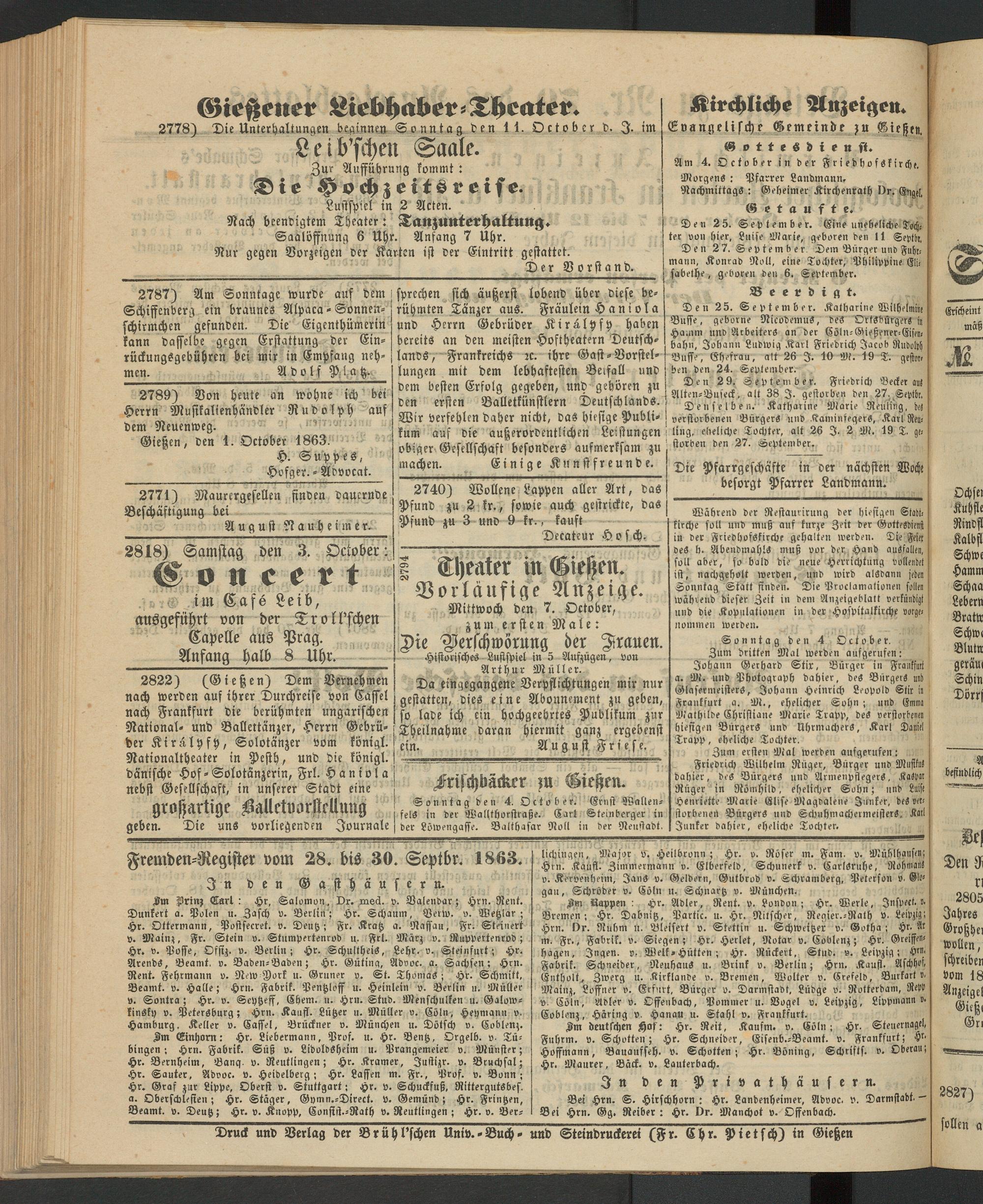 Fremden-Register vom 28. bis 30. Septbr. 1863.