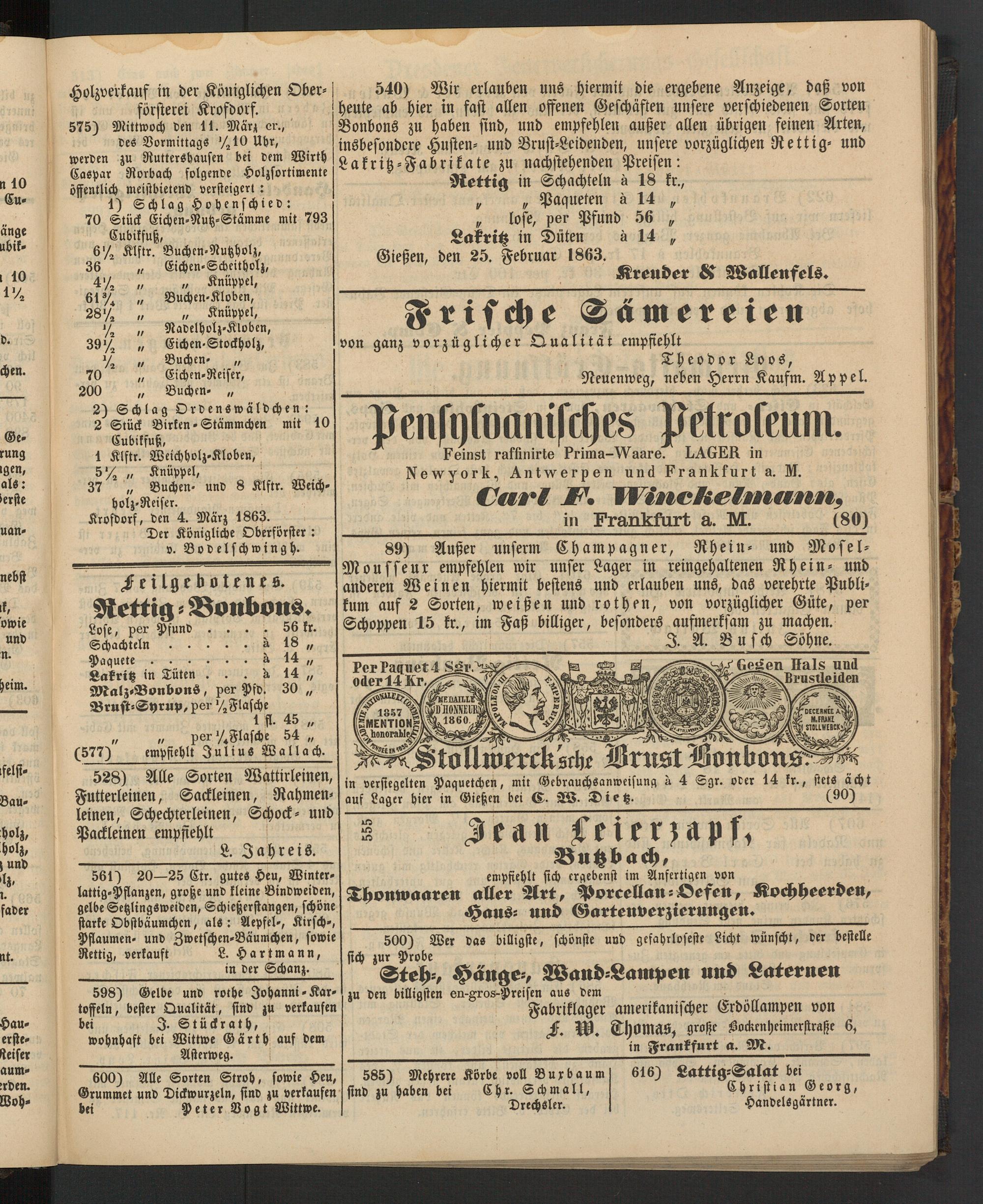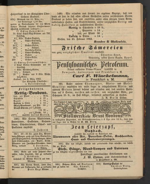 540) Wir erlauben uns hiermit die ergebene Anzeige, daß von heute ab hier in fast allen offenen Geschäften unsere verschiedenen Sorten Bonbons zu haben sind, und empfehlen außer allen übrigen feinen Arten, insbefondere Husten- und Brust-Leidenden, unsere vorzüglichen Rettig- und Lakritz-Fabrikate zu nachstehenden Preisen: