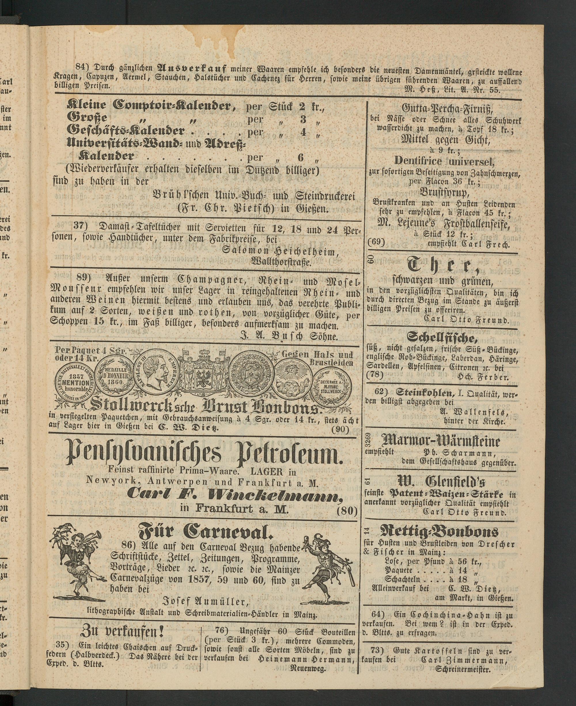 86) Alle auf den Carneval Bezug habende Schriftstücke, Zettel, Zeitungen, Programme, Vorträge, Lieder rc. re., sowie die Mainzer Carnevalzüge von 1857, 59 und 60, sind zu haben bei