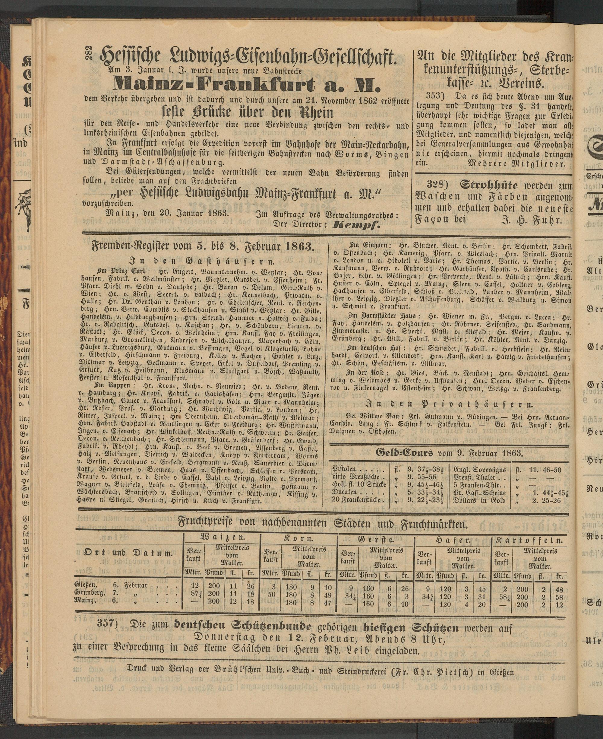 Im Darmstädter Haus: Hr. Wiener m. Fr., Bergm. v. Lueea; Hr. Fay, Handelsm. v. Holzbausen; Hr. Röhrner, Seifensied., Hr. Sandmann, Zimmermstr. u. Hr. Specht, Müll. v. Alsfeld; Hr. Meier, Kaufm. v. Grünberg; Hr. Will, Fabrik, v. Berlin; Hr. Köhler, Rent. v. Danzig.
