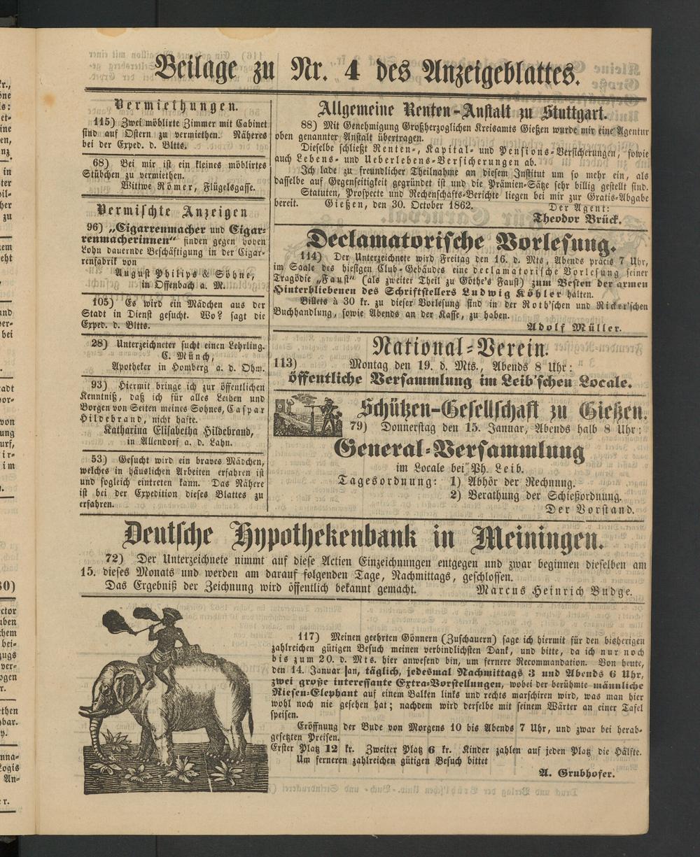 Statuten, Prospekte und Rechenschafts-Berichte liegen bei mir zur Gratis-Abgabe bereit. Gießen, den 30. Oktober 1862. D e r A g e n t: "