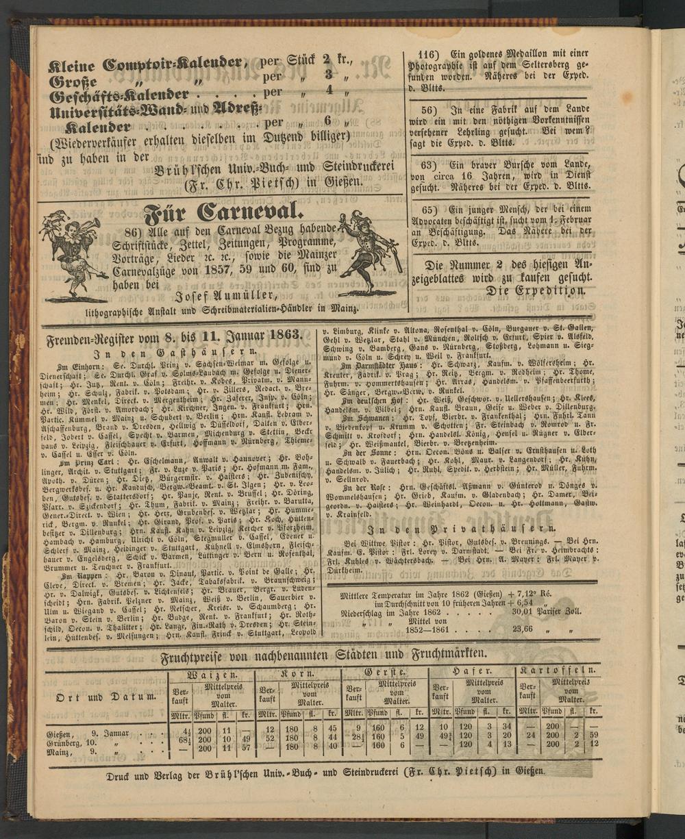 Fremden-Register vom 8. bis 11. Januar 1863. In den Gasthäusern.