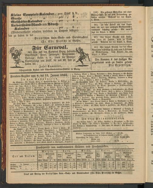 Im Darmstädter Haus: Hr. Schwarz, Kaufm. v. Wolfersheim; Hr. Kreuter, Fabrik. ». Prag; Hr. Reitz, Bergm. v. Rodheim; Hr. Thome, Fuhrm. v. Hommertshausen; Hr. Arras, HandelSm. n. Pfaffenbeerfurth; Hr. Sänger, Bergw.-Berw. ». Runkel. e