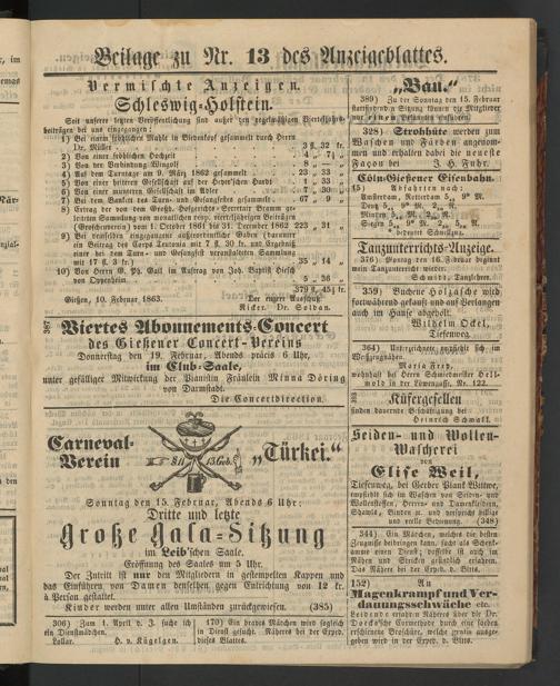 Donnerstag den 19. Februar, Abends präcis 6 Uhr, im Club-Saale, unter gefälliger Mitwirkung der Pianistin Fräulein Minna Döring von Darmstadt.