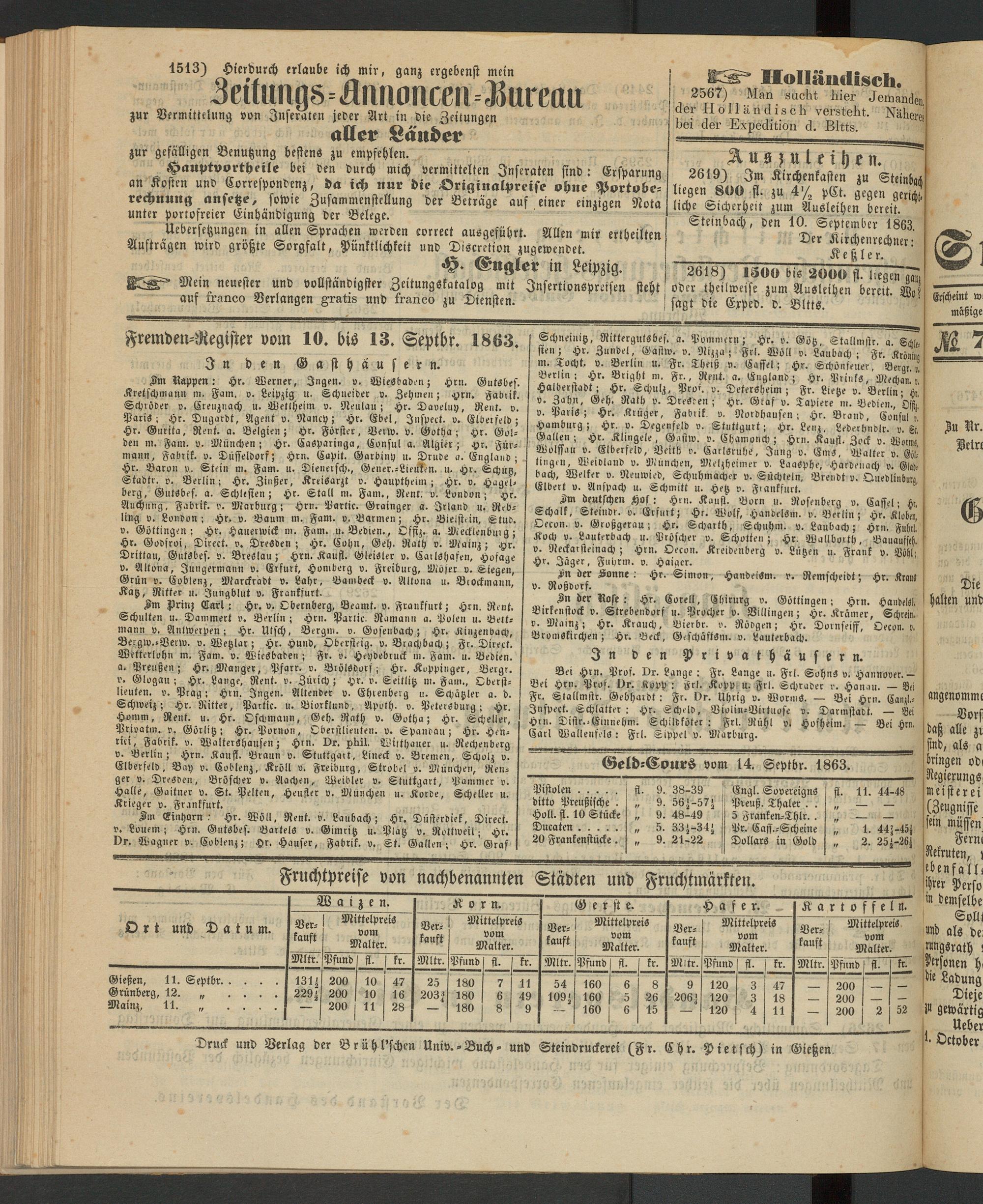 Fremden-Register vom 10. bis 13. Septbr. 1863.