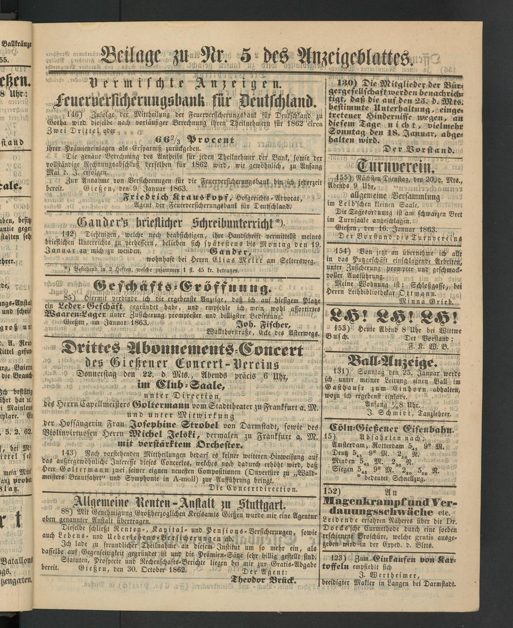 Zur Annahme von Versicherungen für die Feuerversicherungsbank bin ich jederzeit bereit. Gießen, den 9. Januar 1863.