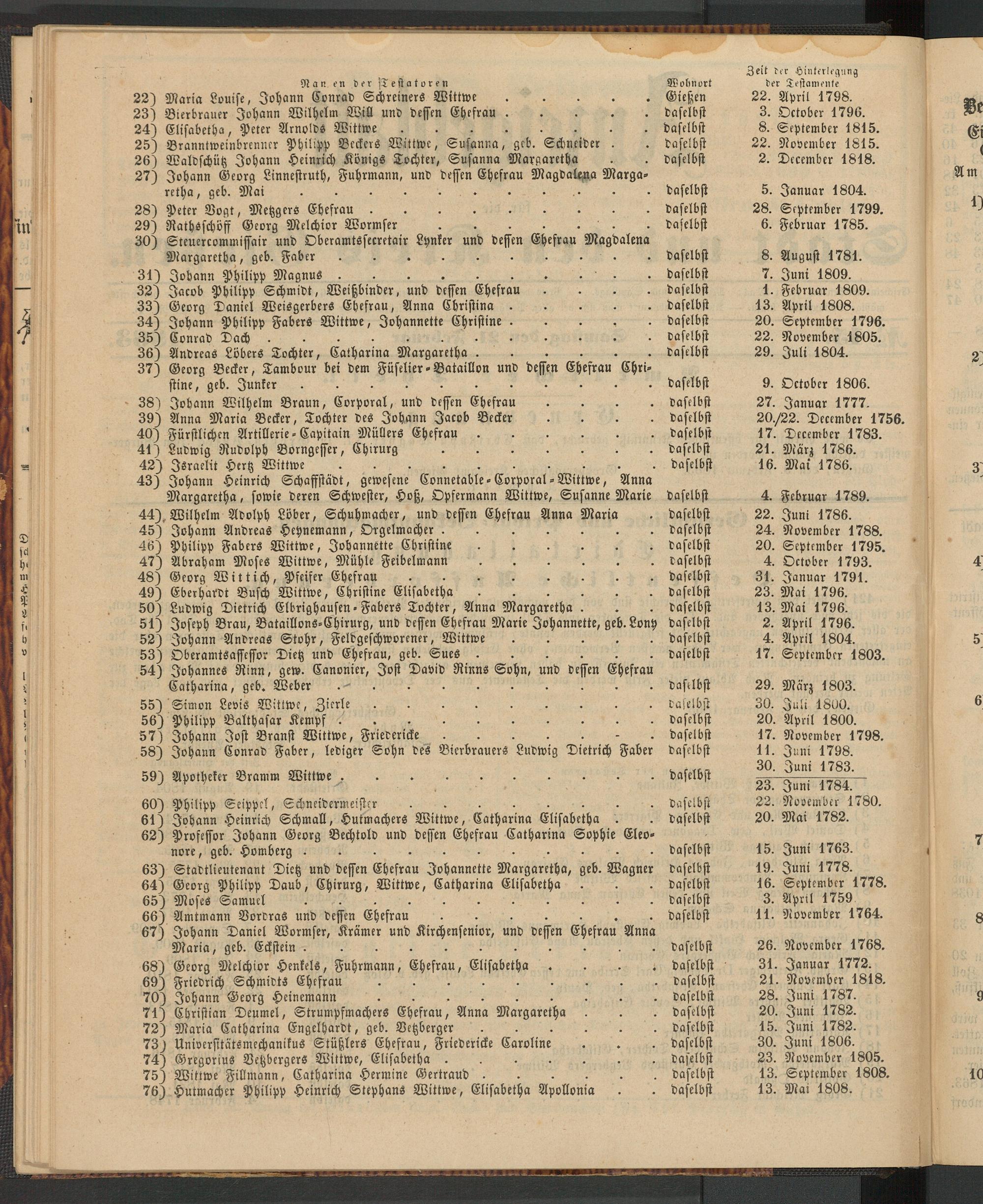22) Maria Louise, Johann Conrad Schreiners Wittwe Gießen 23) Bierbrauer Johann Wilhelm Will und dessen Ehefrau daselbst 24) Elisabeths, Peter Arnolds Wittwe........daselbst