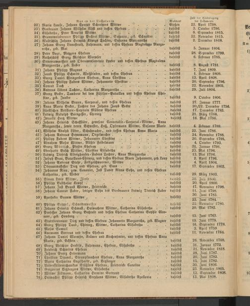 32) Jacob Philipp Schmidt, Weißbinder, und dessen Ehefrau .... daselbst 33) Georg Daniel Wcisgerbers Ehefrau, Anna Christina daselbst 34) Johann Philipp Fabers Wittwe, Johannette Christine .... daselbst 35) Conrad Dach............vaselbst
