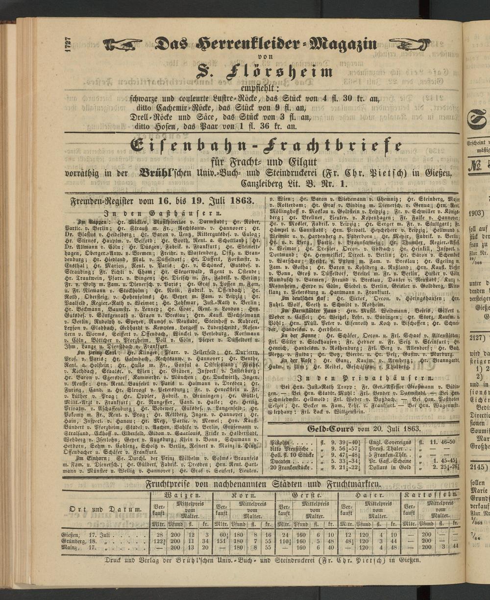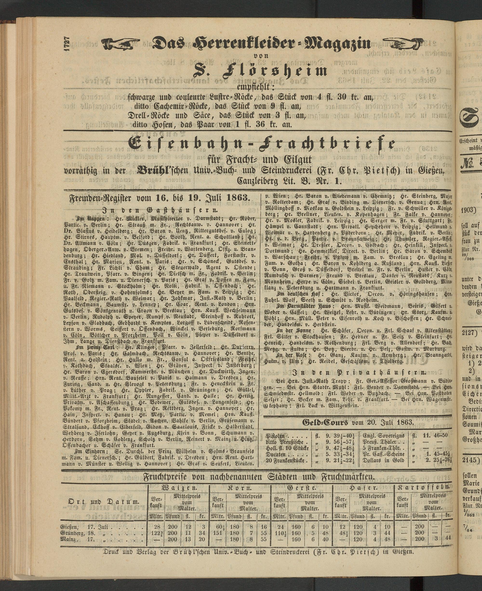 Fremden-Register vom 16. bis 19. Juli 1863.