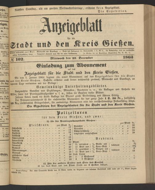 Wl dem 1. Januar 1864 beginnt ein. neue« Atannemen, auf das An zeig et la, I für die Stadt UNV den Kreis Gießen. Dasselbe erscheint auch ferner wöchentlich zweimal, Mtttwochs und Samstags, an letzterem Tage verbunden mit der Beilage: