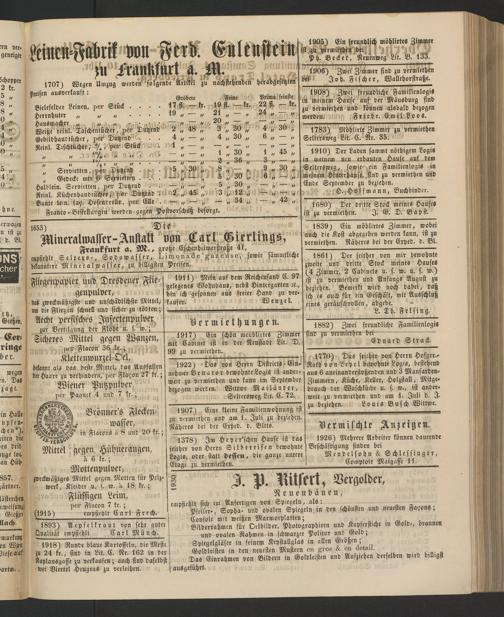 Frankfurt a. M., große Eschenheimerstraße 41, empfiehlt Selters-, Sodawasser, Limonade gazcuse, sowie sammtllche bekanntere Mineralwasser, zu billigsten Preisen.