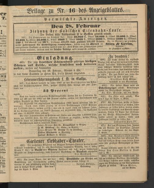 499) Die verehrlicken Mitglieder des Gießener Liebhaber-Theaters werden hiermit nochmals benachrichtigt, daß die erste Unterhaltung kommenden Sonntag, den 1. März, Abends 7 Uhr, im Busch'schen Garten stattfindet und daß, wegen diesmaligen Wegfalls der Tanzunterhaitung, nach beendigter Vorstellung ein Bankett abgehalten mirb Der Vorstand.