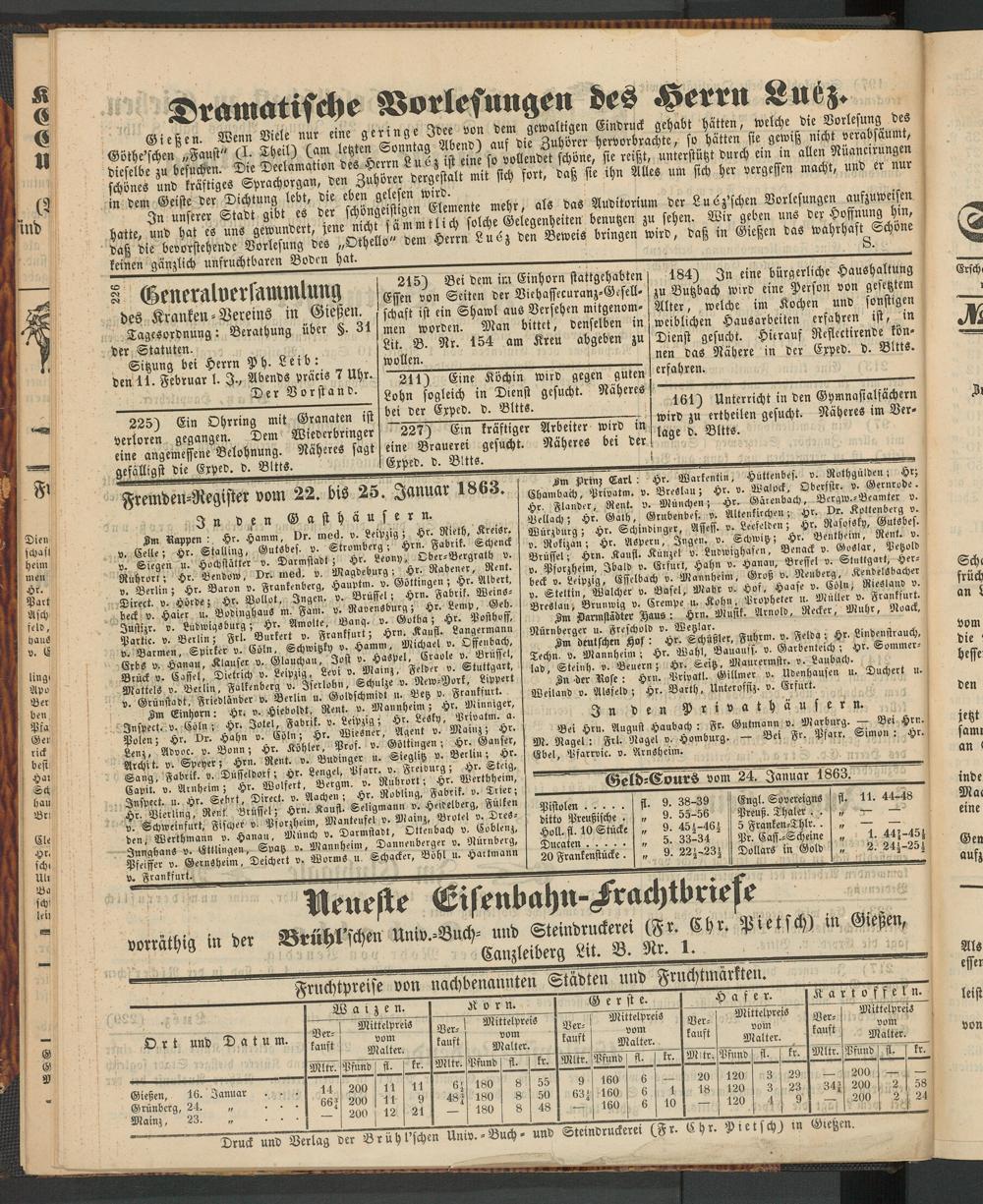 225) Ein Ohrring mit Granaten ist verloren gegangen. Dem Wiederbringer eine angemessene Belohnung. Näheres sagt gefälligst die Exped. d. Bitts. _